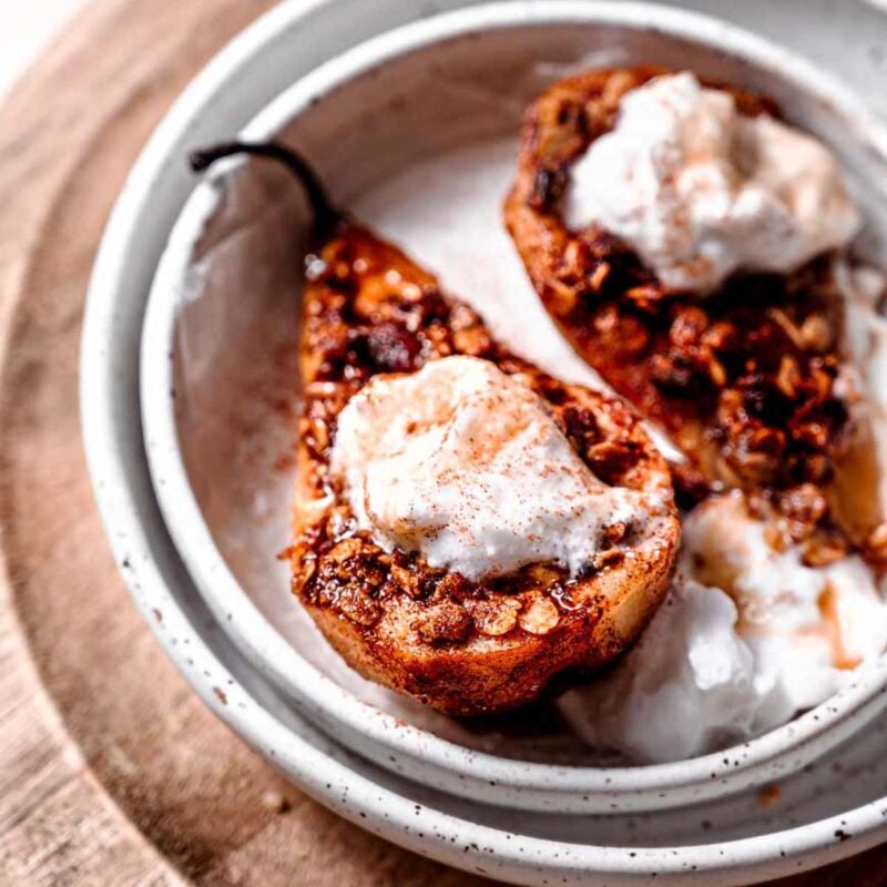 This also helps to caramelize the exterior. Feel free to swap in maple syrup, coconut sugar (or one of these coconut sugar alternatives). You can also use Swerve’s Brown Sugar Substitute to make these pears sugar free.