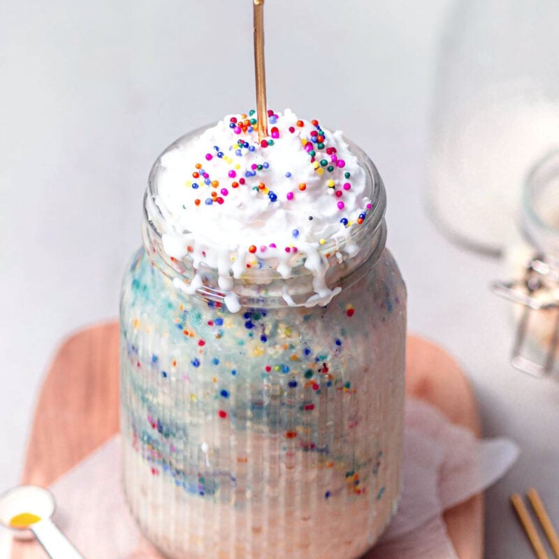 These birthday cake overnight oats are sweet, creamy, and taste just like cake batter! Blend up these funfetti oats for an even creamier texture and top them with lots of sprinkles, whipped cream, and a white chocolate shell for a fun yet healthy morning treat.