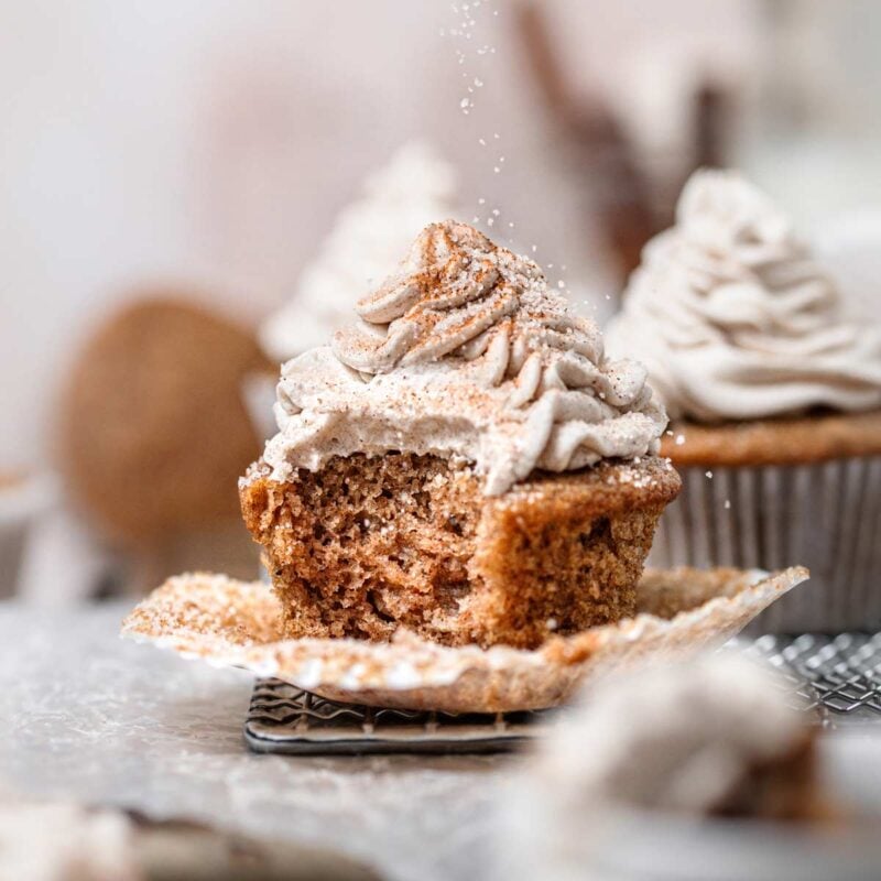 You can sprinkle a bit of cinnamon sugar on top or even add a cinnamon stick for the perfect finishing touch. If you want to switch it up…these cupcakes would also be delicious with my vegan cream cheese frosting!