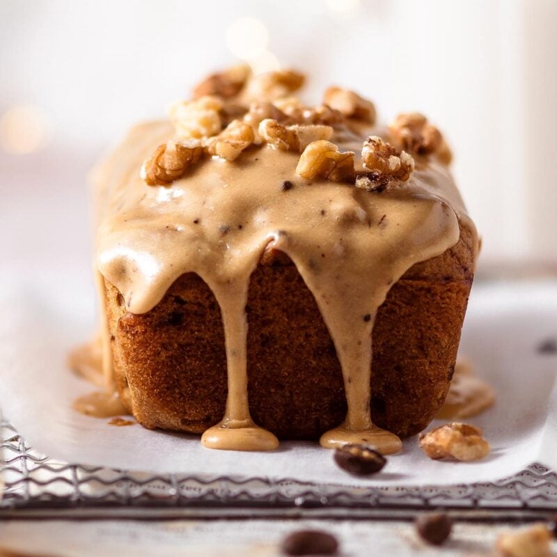 - Let the loaf cool for 5 minutes in the pan, then transfer it to a wire rack to cool completely before glazing.Mix all the glaze ingredients together in a small bowl. When drizzling the glaze, it should form thick ribbons. Add more powdered sugar or coffee as needed to thicken or thin the icing. Spoon onto the cooled cake.¾ cup powdered sugar or icing sugar, 2 tbsp pure maple syrup, 1 tbsp melted vegan butter, 1 tsp instant espresso, 1-2 tsp strong brewed coffee