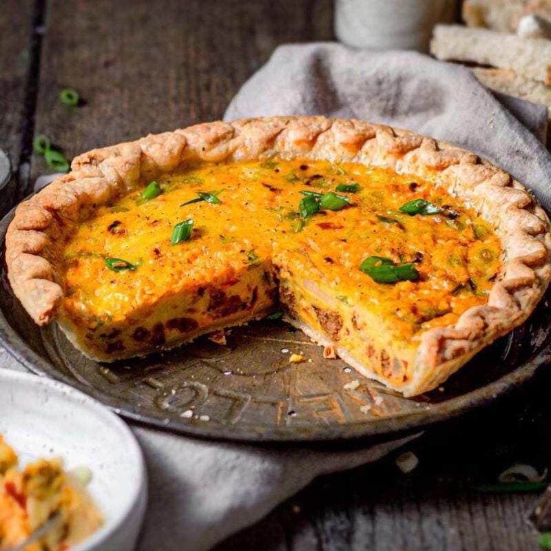 This vegan Just Egg quiche is incredibly easy and tastes just like the classic version… but without eggs, dairy, or tofu! It’s filled with high protein vegan sausage, sautéed bell peppers, and green onions for bold flavor in every bite.