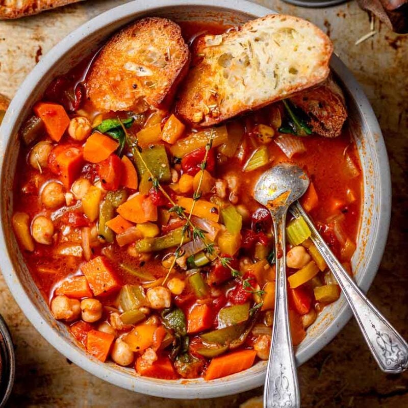 This 10 vegetable soup is super hearty by itself and can certainly be eaten on its own. But it’s next level when served with a simple garlic herb crostini, cornbread or crusty bread.
