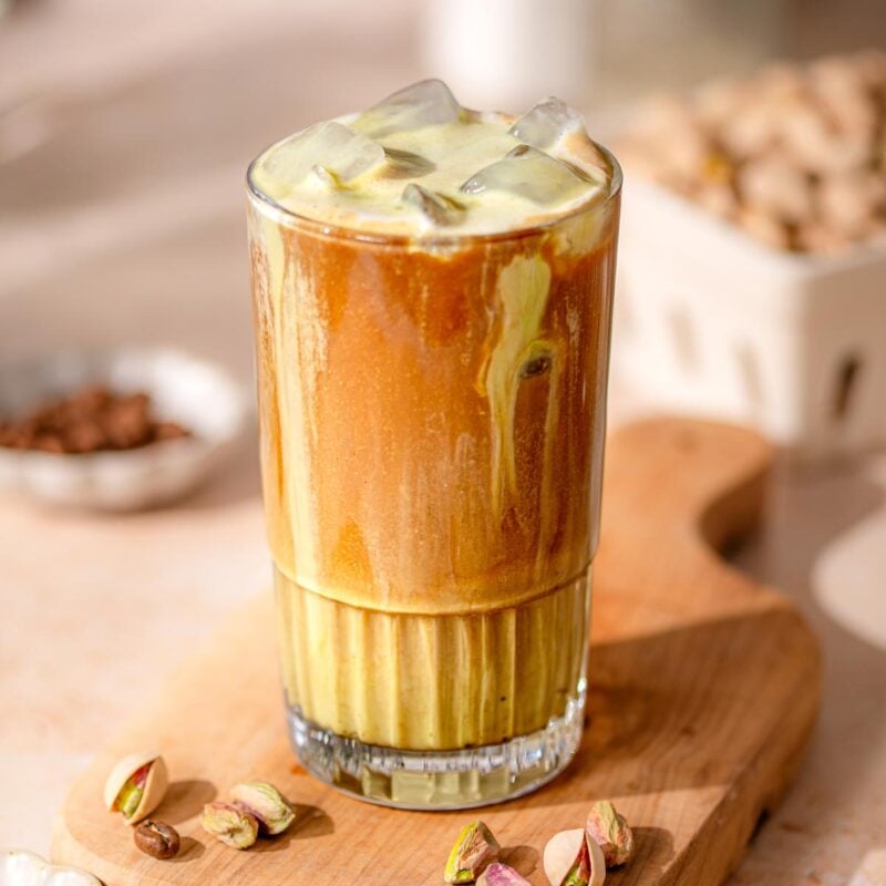 If you can’t find pistachio cream, a pistachio simple syrup works too. The flavor will be lighter and sweeter, but it still gives you that cozy pistachio vibe without extra effort.
