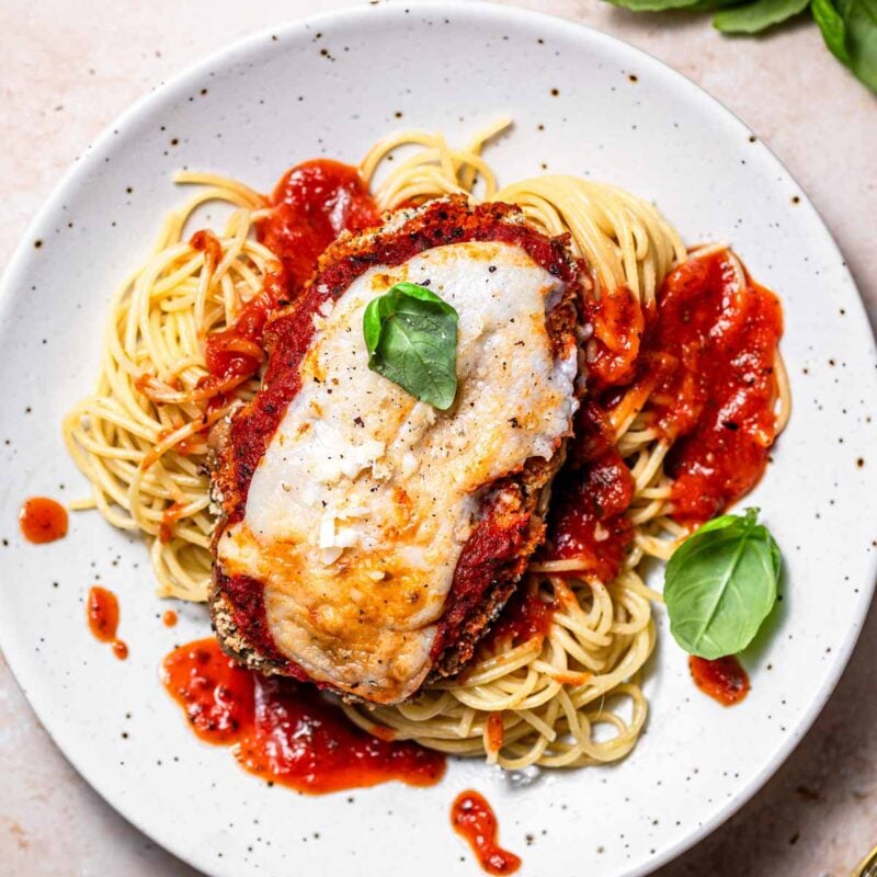 - While the seitan continues to cook, prepare the pasta according to the package instructions.Plate the vegan chicken parmesan on top of the cooked spaghetti with warmed marinara. Top with fresh basil and more grated vegan parmesan.1 lb thin spaghetti
