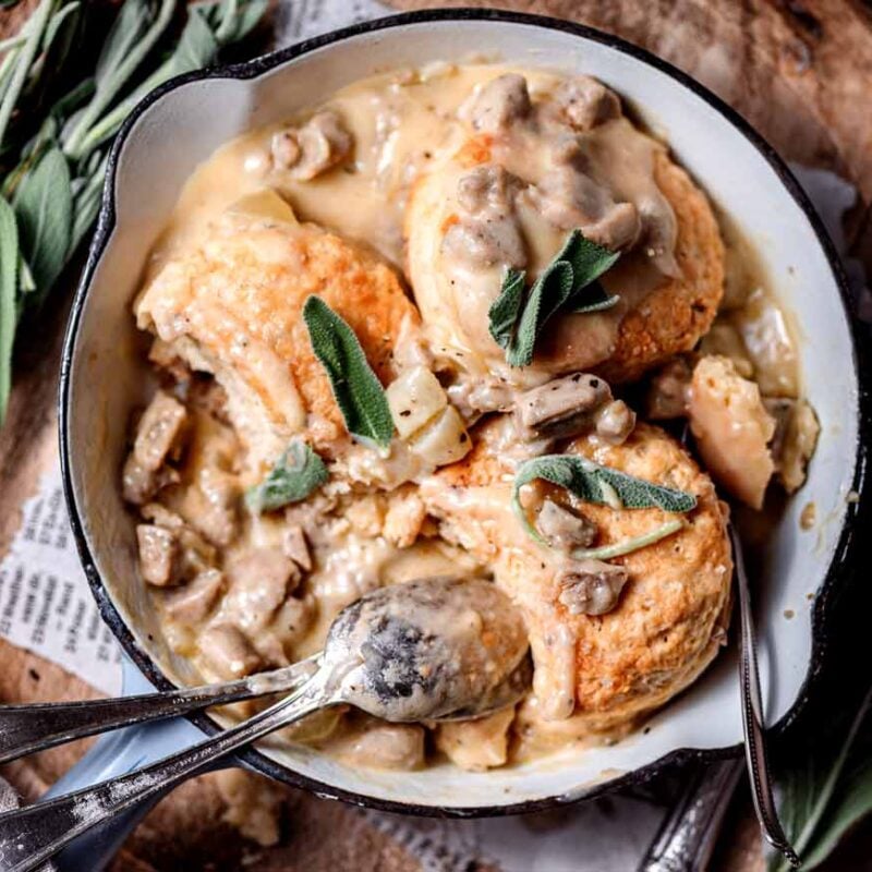 I recommend using a plant-based breakfast sausage in the gravy. A few of my favorite store-bought versions are Beyond Meat’s Breakfast Sausage Links and Field Roast’s Apple Maple Breakfast Sausage. You can dice up vegan sausage links or use plant based sausage crumbles.