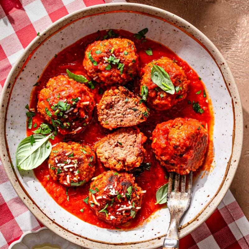 Once they’re browned, you can add your favorite sauce, like marinara, and finish with fresh herbs if you’d like. I don’t recommend skipping the pan frying- it really helps improve the overall texture and helps finish cooking the meatballs.