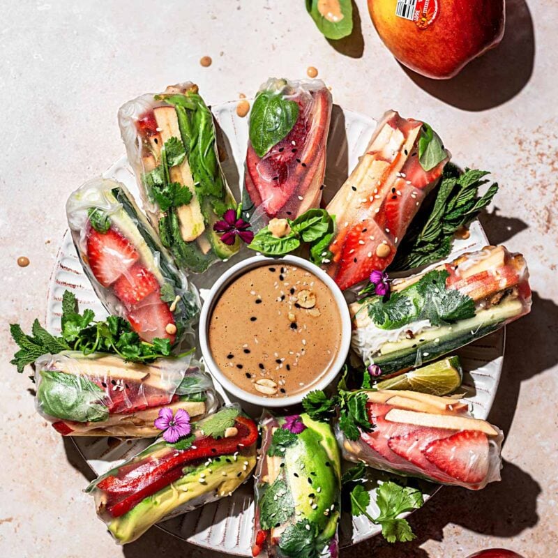 The peanut sauce is just SO good. Like you want to pour it on everything good. Plus, the fresh herbs, crunchy veggies and sweet fruit make these summer rolls perfect for any Spring or Summer weeknight dinner.